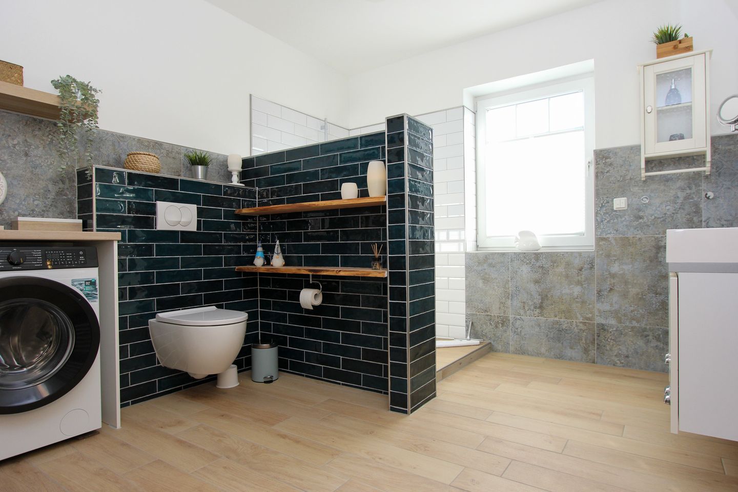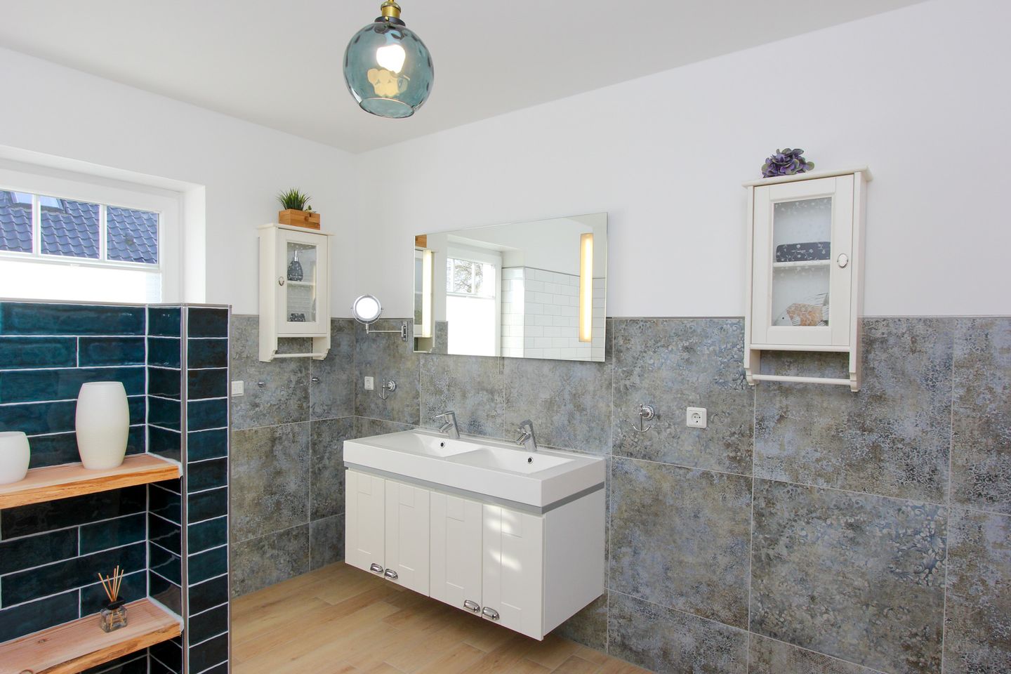 Die Wohnung verfügt über ein gemütliches Schlafzimmer mit einem komfortablen Doppelbett und einem großzügigen Kleiderschrank, der ausreichend Platz für Ihr Gepäck bietet. Im Wohnbereich erwartet Sie ein praktisches Schrankbett (160 x 200 cm), das zusätzlichen Schlafraum schafft. Das moderne Duschbad ist mit einer eleganten Eckbadewanne, einem Doppelwaschbecken und Tageslicht ausgestattet – perfekt für entspannende Momente nach einem erlebnisreichen Tag.