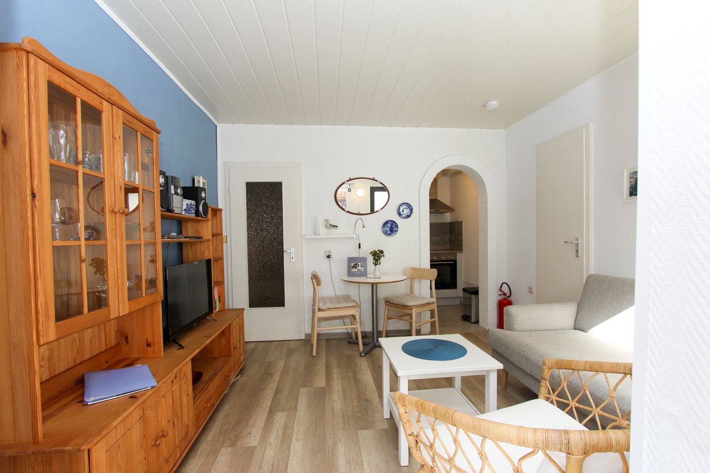 Die Erdgeschosswohnung bietet auf ca. 27 m² ausreichend Platz für 2 Personen mit gemütlichem Wohnzimmer, Schlafzimmer mit Doppelbett, Duschbad und einer Pantryküche. Im Wohnzimmer befindet sich eine einladende Fernsehcouch und ein Esstisch. Das Schlafzimmer verfügt über 2 Einzelbetten.