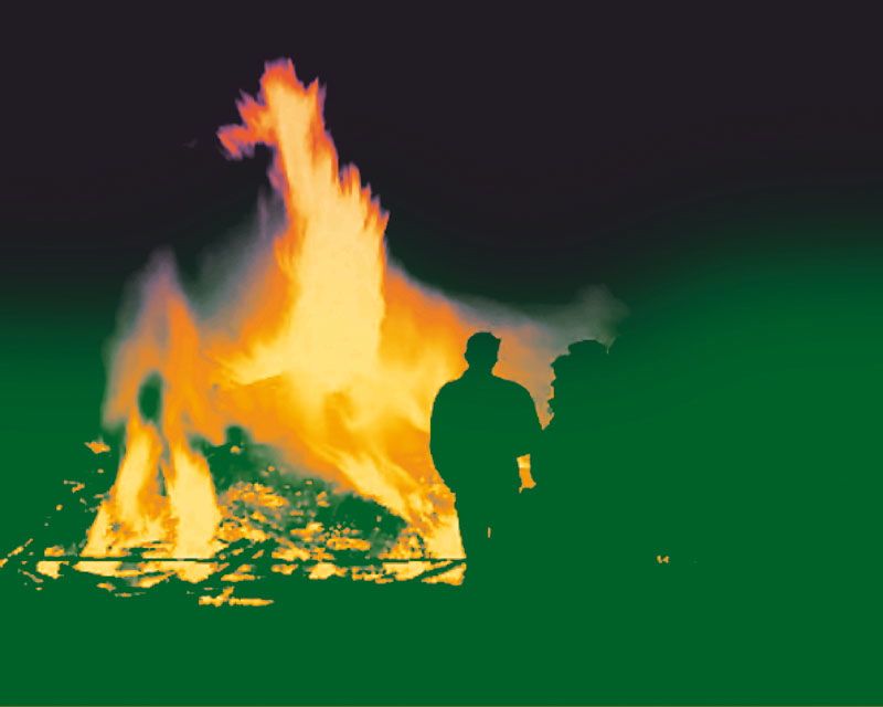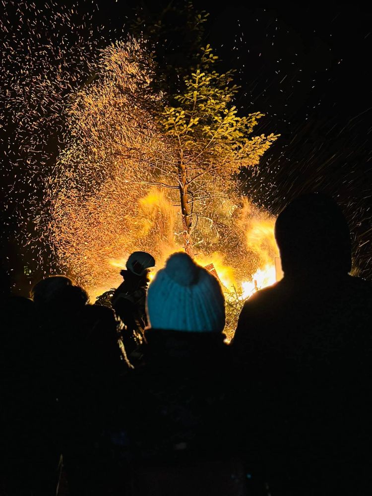 Die Borner sagen ihren Weihnachtsbäumen beim Lagerfeuer auf der Festwiese „Tschüß". Unter Aufsicht der freiwilligen Feuerwehr und organisiert von der