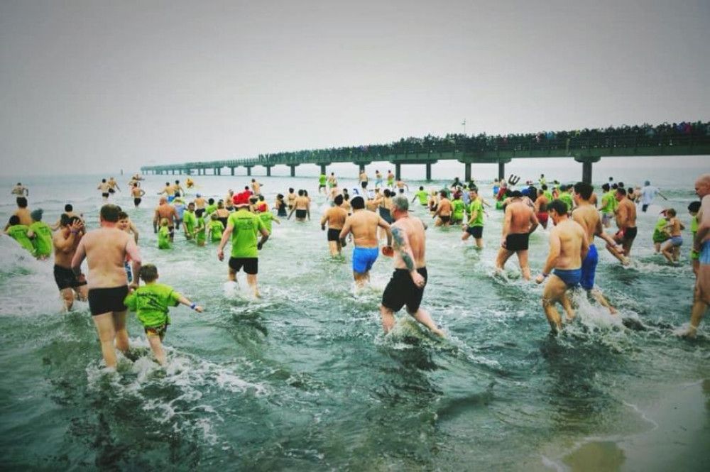 in Badehose, schrägen Kostümen oder im FKK-Look in die 4°C kalte Ostsee. Es folgt ein Planschen, Kreischen, Lachen und Jauchzen. Als Belohnung warten am Strand